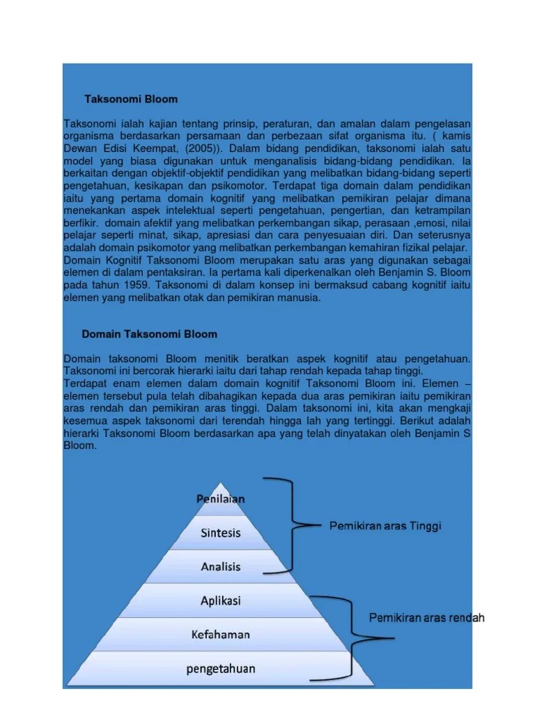 Kajian mendapati pengajaran bertumpu pada aras kognitif rendah dan terdapat jurang. Menurut bloom bs 1979 terdapat enam aras kemahiran dalam domain kognitif iaitu pengetahuan kefahaman aplikasi analisis sintesis dan penilaian. Domain kognitif taksonomi bloom merupakan satu aras yang. Contohnya, jika soalan tersebut hanya mengandungi 1 markah, soalan yang diberikan merupakan soalan asas iaitu soalan pengetahuan yang mana .